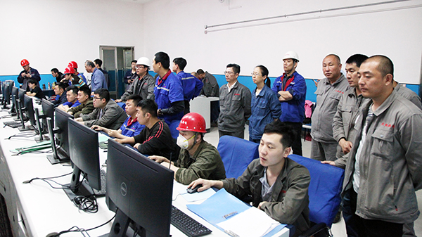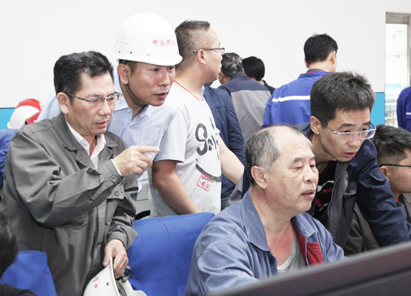 4萬(wàn)機(jī)組一次并網(wǎng)成功后,集團(tuán)總工程師李成玉(右三)、項(xiàng)目建設(shè)部長(zhǎng)胡林桂(右一)中鑫熱電總經(jīng)理韋毅民(右二)和副總經(jīng)理李樹(shù)彬(右四)同部分生產(chǎn)、技術(shù)管理骨干在中控室露出歡快的笑容!